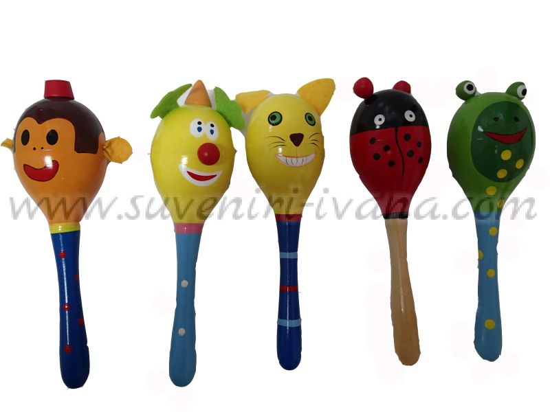 Дървен маракас с ръчна декорация. Приблизителни размери 21,0 х 6,0 см. Предлагат се различни модели.