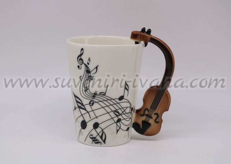Бяла порцеланова чаша с музикални ноти и дръжка с формата на виола в естествен цвят. Размери 11,0 х 7,2 см. Чудесна идея за подарък за любителите на класическата музика.