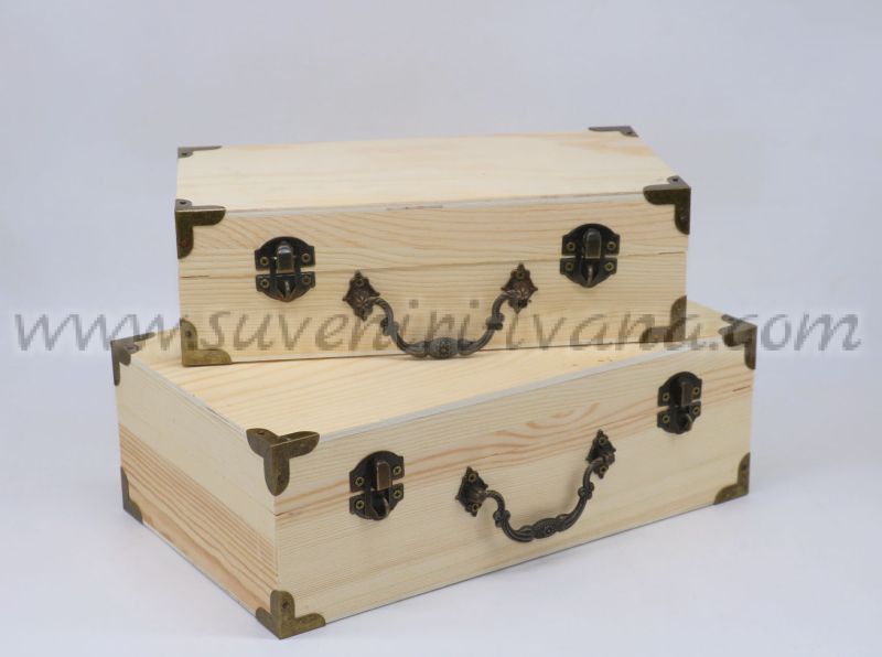 Комплект два броя дървени кутии от натурално дърво с формата на куфар, подходящи за декупаж и всякакъв друг вид декорация. Размери: голяма - 27,0 х 16,5 х 9,0 см. малка - 23,5 х 13,0 х 7,5 см.