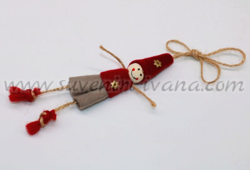 Ръчно изработени коледни човечета за декорация, модел три. За направата му са използвани филц, вълна, дърво, конопен шнур. Приблизителни размери на човечето 11,0 х 2,5 см. Подходящо допълнение към коледната украса.