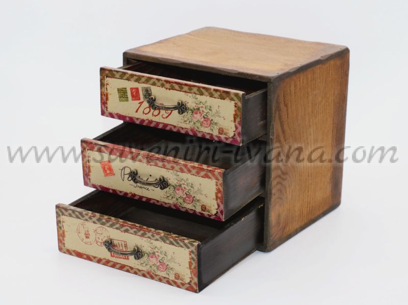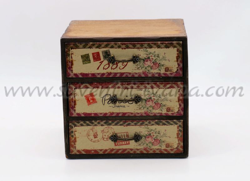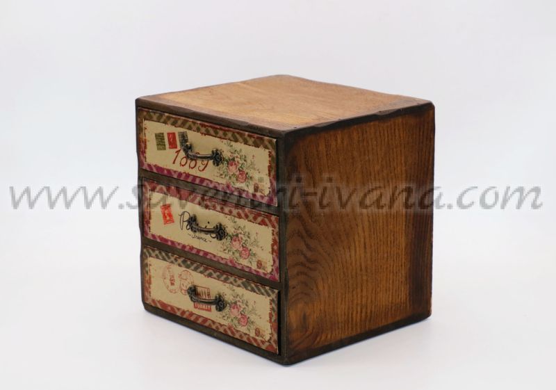 Дървено мини шкафче с три малки чекмеджета, предните страни на които са в ретро винтидж стил. Размери на шкафчето 18,0 х 16,0 х 18,0 см. Чекмеджетата са с размери 16,5 х 5,0 х 16,0 см. и са подходящи за съхранение на различни дребни предмети.