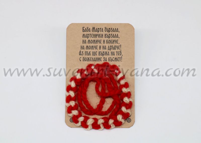 Ръчно изработена мартеница за ръка, направена от преплетени нишки вълнена прежда. Мартеничката се предлага в целофанено пликче и картонче с първомартенско стихче от предната страна и кратка легенда за мартеницата от задната.